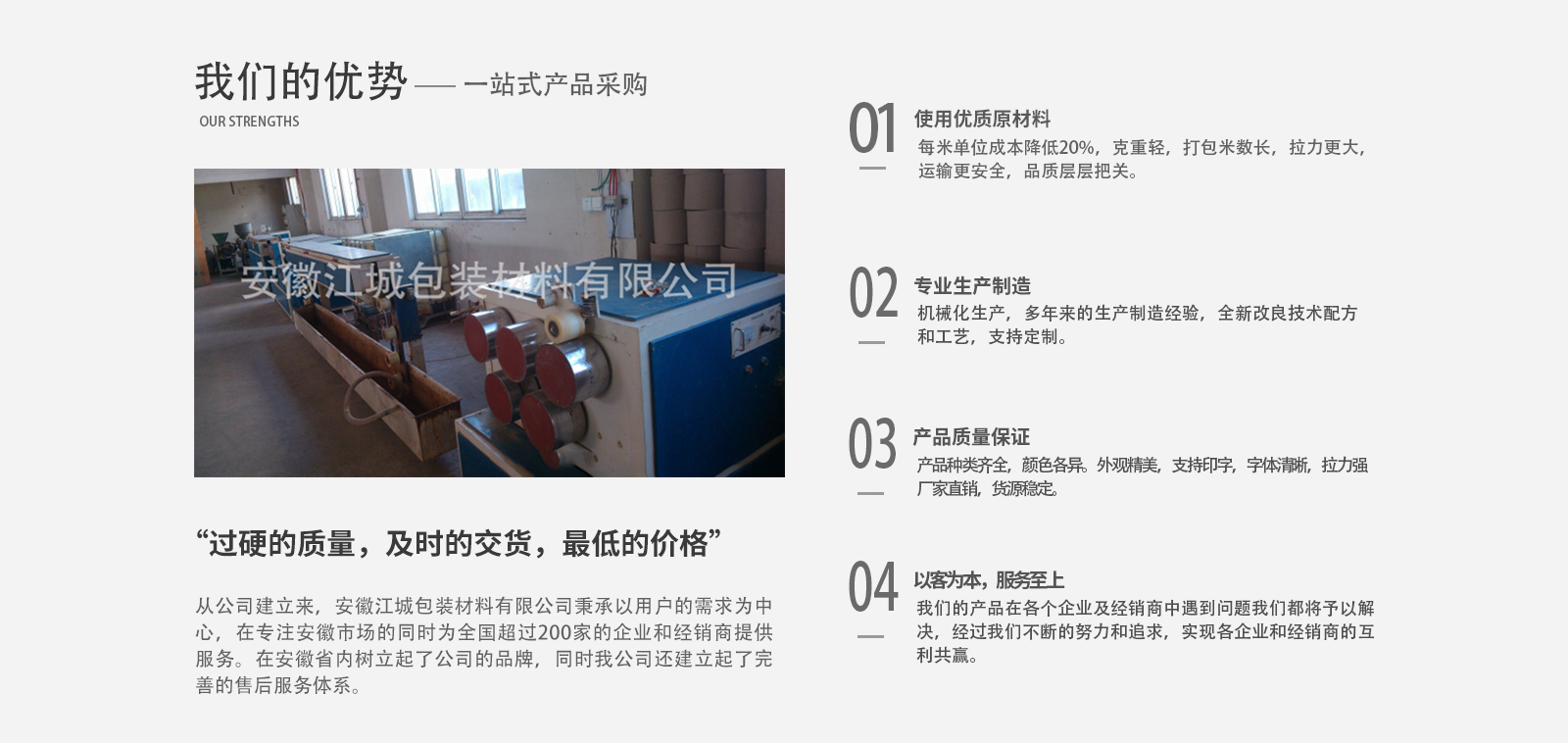 安徽江城包裝材料有限公司成立于2008年,注冊于2010年,公司總部設(shè)立在安徽蕪湖,是安徽省內(nèi)專業(yè)生產(chǎn)與銷售打包帶、透明膠帶的公司之一。公司主要效勞于大中小企業(yè),并大力開發(fā)省內(nèi)經(jīng)銷商。公司以“過硬的質(zhì)量,及時(shí)的交貨,低的價(jià)格”,為企業(yè)的立身之本。希望用我們的不懈努力,帶給我們客戶大的效益。從公司建立來,安徽江城包裝材料有限公司秉承以用戶的需求為中心,在專注安徽市場的同時(shí)為全國超過200家的企業(yè)和經(jīng)銷商提供服務(wù),“過硬的質(zhì)量,及時(shí)的交貨,低的價(jià)格”博得了縱多的企業(yè)和經(jīng)銷商的好評,在安徽省內(nèi)逐步樹立起了公司的品牌,同時(shí)我公司還建立起了完善的售后服務(wù)體系。為我們的產(chǎn)品在各個企業(yè)及經(jīng)銷商中遇到的問題予以解決,經(jīng)過我們不斷的努力和追求,實(shí)現(xiàn)各企業(yè)和經(jīng)銷商的互利共贏。